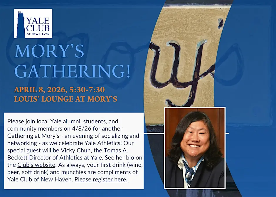 Please join local Yale alumni, students, and community members on April 8 for another Gathering at Mory’s - an evening of socializing and networking - as we celebrate Yale Athletics! Our special guest will be Vicky Chun, the Thomas A. Beckett Director of Athletics at Yale.